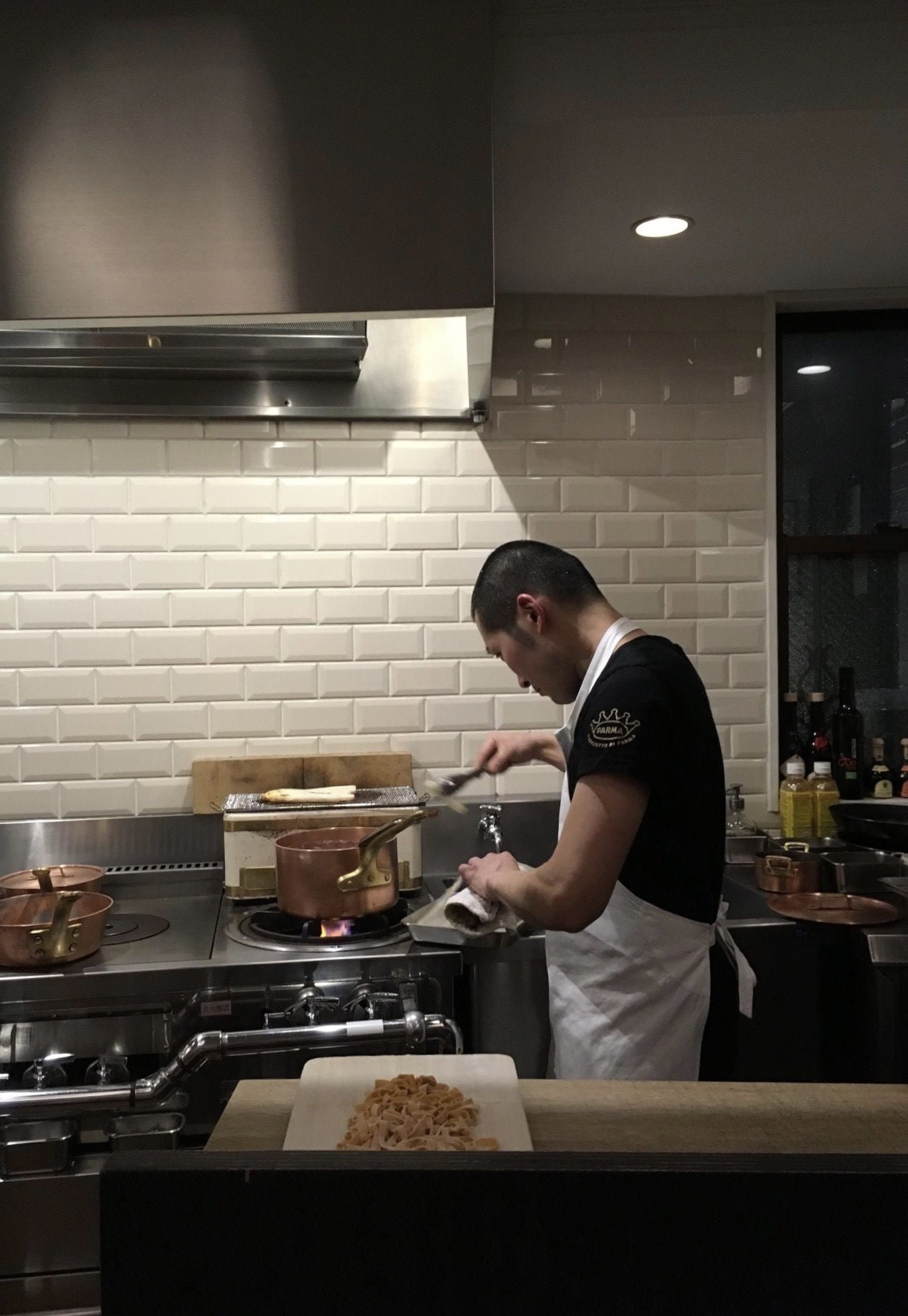 初訪Pellegrino 這間榮獲Tabelog 認證全東京第一名的義大利餐廳,很難想像餐廳主廚—高橋隼人,在沒有任何服務生、侍酒師的情況下,徹底執行自家製的現場秀。秉持以食材為本的初衷,從晨間烘焙的Ciabatta 、慢火燉煮15小時的軍雞清湯、現場操作起專業生火腿切片機、現桿的新鮮義大利麵,到最後現打的Gelatto 甜點,皆能感受到高橋主廚對細節的認真和堅持。